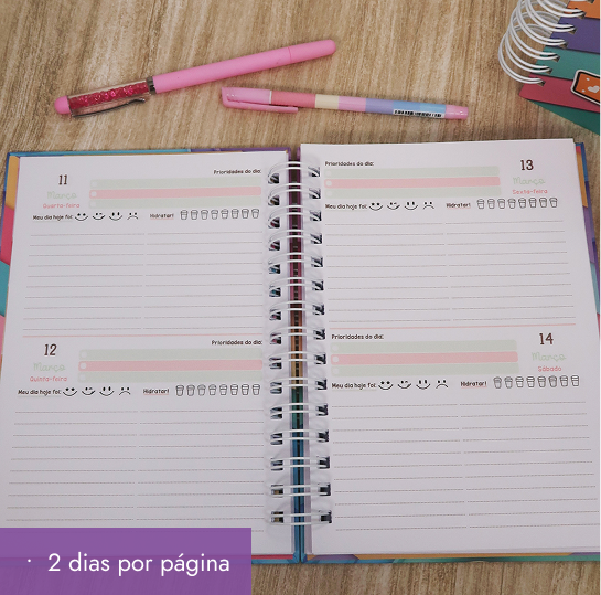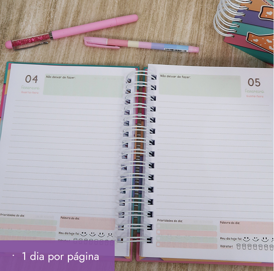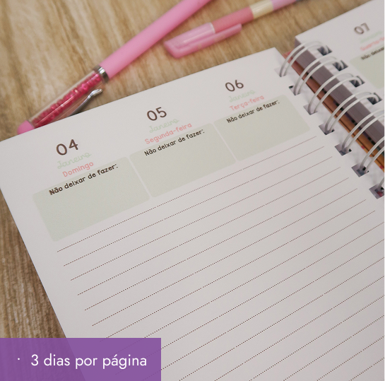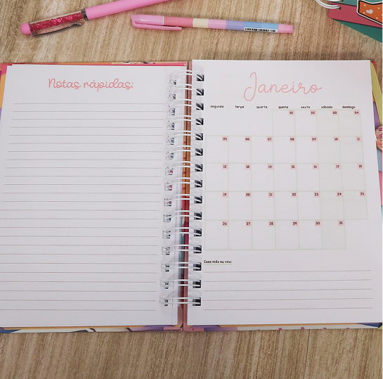 A Agenda Clássica com calendário lateral é perfeita para quem prefere uma organização mais direta. Disponível em diferentes configurações de página, com ou sem horários, e diversas opções de cores. Personalize a sua!